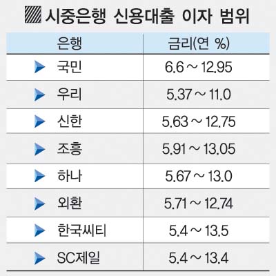 현재 시중은행의 신용대출 최저금리는 연 5∼6% 정도다. 반면 최고금리는 12∼13%로 갑절 이상 차이가 난다. 웬만한 신용등급을 갖춘 고객은 최저금리 수준의 대출을 예상하겠지만 5∼6%대의 금리 혜택을 받는 사람은 의사·변호사 등 전문직 종사자나 공무원, 은행과 특별 협약을 맺은 몇몇 우량 대기업 직원뿐이다.
