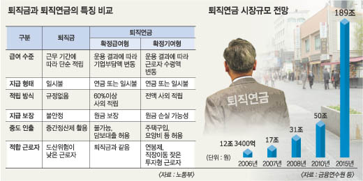 오는 12월 도입되는 퇴직연금 제도 시행을 앞두고 은행·보험·증권 등 금융권이 후끈 달아올랐다. 내년 시장규모가 12조원이나 되고, 퇴직자금의 속성상 한번 고객은 평생 고객이 될 가능성이 높아서 그런지, 선점(先占) 경쟁이 치열하다.10년 뒤에는 시장이 189조원으로 커져 금융권의 지각변동도 예상된다. 퇴직연금에 대한 이해를 높여 노후대비 등에 도움을 주기 위해 금융권 움직임과 상품 특성 등을 시리즈로 다룬다.