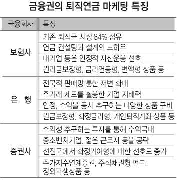금융권의 퇴직연금 상품 판매전은 보험사와 은행의 ‘불꽃 맞대결’과 증권사의 ‘틈새 전략’에서 승부가 가려질 것으로 예상된다. 각 금융권은 기업과 근로자를 상대로 한 홍보전을 끝내고 다음달 1일 그동안 비밀리에 준비한 고유 상품들을 출시하며 판매전에 들어간다.