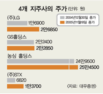 대우증권에 따르면 STX의 지난 18일 종가는 1만 3700원으로 지난해 12월30일 종가(6820원)보다 갑절 뛰었다. 반면 뛰어난 경영 실적을 기록중인 GS홀딩스의 주가는 썩 재미를 못보고 있다. 지난 18일 2만 2850원을 기록해 지난해 말(2만 2400원)보다 겨우 450원 올랐다.㈜LG와 농심홀딩스의 주가는 2만 6850원과 25만 4500원을 기록해 지난해 말보다 각각 58%,2% 올랐다.