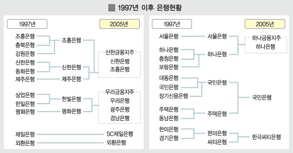 이 때부터 은행들은 8%를 맞추는 데 사활을 걸었지만 대동, 동남, 동화, 경기, 충청은행이 퇴출됐고, 상업은행과 한일은행이 합병되는 등 지각변동 속으로 빠져 들었다. 내년 신한·조흥은행이 통합되면,‘빅5’로 불렸던 ‘조상제한서(조흥, 상업, 제일, 한일, 서울은행)’가 역사속으로 사라진다.