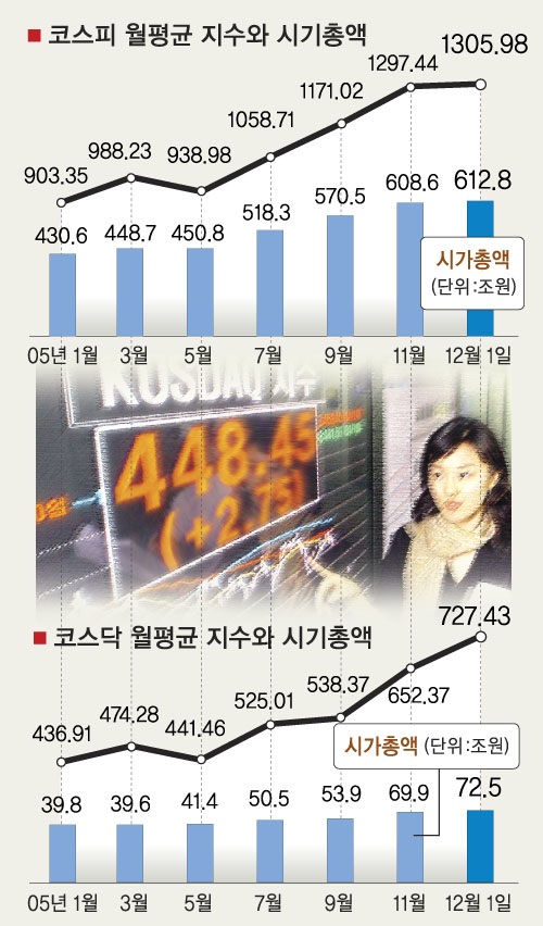 올 들어 코스피지수는 893.71(1월3일)에서 출발,5월에만 평균치가 잠시 주춤했을 뿐 매월 꾸준히 오르면서 400포인트 이상 상승했다. 코스닥지수도 390.40에서 시작해 5월에만 멈칫했을 뿐 두배 가까이 올랐다. 코스닥지수는 지난달 21일 연속 상승이라는 깨지기 힘든 기록도 세웠다.