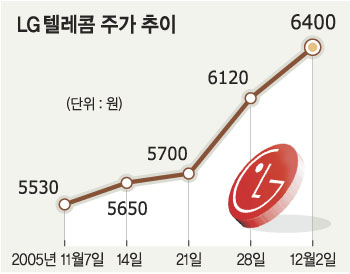 LG텔레콤의 최근 강세는 이유가 있다. 지난달 순증 가입자가 7만 3079명으로 이동통신 3사 가운데 가장 큰 폭으로 늘었다. 전체 가입자는 642만 1492명으로 올 연말까지의 목표치 650만명 돌파에 바짝 다가섰다. 게다가 휴대전화 성수기인 연말, 졸업, 입학을 앞둔 시기여서 목표 가입자 달성은 무난할 것으로 보인다.