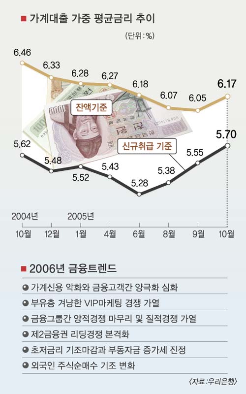 우리금융그룹이 7일 발표한 ‘2006년 국내 금융트렌드’ 보고서에 따르면 금리상승으로 가계의 이자부담이 급증하면서 내년 가계 신용이 악화될 것으로 전망됐다. 지난 9월 가계 빚이 500조원을 돌파면서 금리가 1%포인트만 올라도 연간 이자가 32조 5000억원(금리 6.5% 적용)에 이를 것이라는 예측이다.