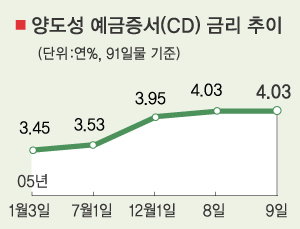 문제는 콜금리 인상이 CD금리에 불을 질렀다는 것이다. 하반기 들어 지속적인 상승세를 보였던 CD금리는 지난달 2일 이후 3.95∼3.97% 사이에서 안정된 움직임을 보였지만 지난 8일 콜금리가 0.25%포인트 오르자 4.03%까지 뛰었고,9일에도 4.03%를 유지했다. 이는 지난해 2월17일 이후 22개월 만에 최고치다.8월 말에 비하면 0.60%포인트 가까이 올랐다.