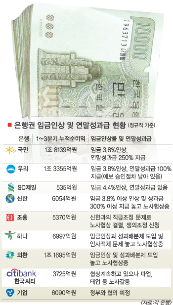 연말 은행원들의 표정이 크게 엇갈리고 있다. 사상 최대의 순이익을 낸 국내 은행들 중 일부는 노사협상이 타결돼 연말 특별성과급 잔치를 벌이기 시작했다. 아직 노사간 막판 줄다리기를 하는 은행이 많지만 곧 타결될 분위기여서 특별 보너스에 대한 직원들의 기대가 높다.
