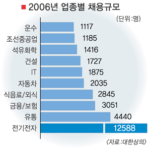 대한상공회의소는 23일 잡코리아와 공동으로 국내 대기업 매출액 순위 상위 500대 기업을 대상으로 조사한 ‘2006년 500대 기업 일자리 기상도’를 통해 내년 이 기업들의 신규 채용규모는 3만 5872명이라고 밝혔다. 이는 올해 실제 채용규모인 3만 5552명보다 0.9% 늘어난 수치다.