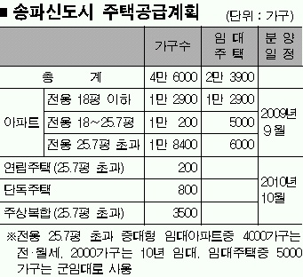 송파신도시에 짓는 아파트는 ▲전용면적 25.7평 이하 2만 3100가구 ▲25.7평 초과 1만 8400가구로 총 4만 1500가구 아파트 중 중대형이 44%다. 이 중 임대주택은 ▲25.7평 이하 1만 7900가구 ▲25.7평 초과 6000가구다.