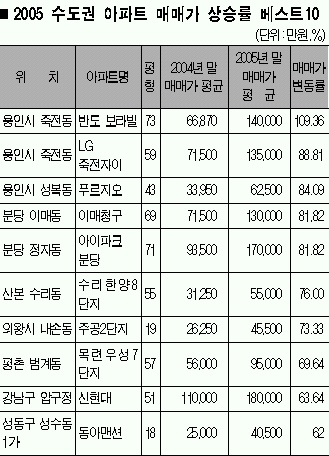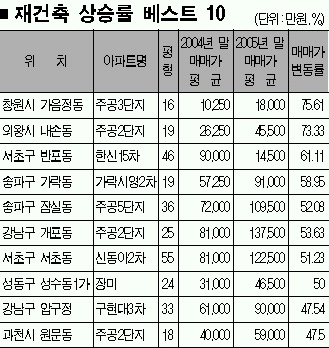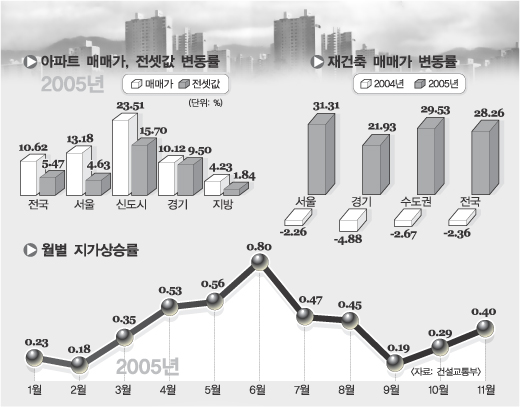 2005년 1년간 전국 재건축 아파트 매매가격 상승률은 평균 28.26%였다.2004년의 마이너스 2.36%에 비해 30%포인트나 올랐다.