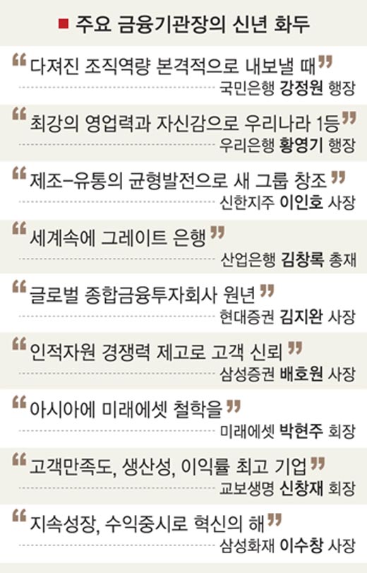 금융기관장들의 새해 현실인식은 “(편하게 돈을 번) 지난해와는 사정이 다르다.”,“기회와 위기의 기로에 섰다.” 등이다. 또 각오는 온통 ‘혁신’‘역량 표출’‘최강의 자신감’‘글로벌 경쟁력’ 등으로 표현했다.