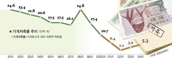 지난 2002년 신용카드 남발에 따른 과소비로 가계 저축률이 2%로 급락한 뒤 가계부채 조정을 거쳐 2004년 저축률이 5.3%로 올라섰으나 다른 나라에 비하면 여전히 낮은 수준이다.