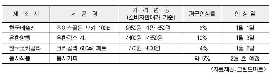 2일 유통업계에 따르면 한국코카콜라, 유한양행, 한국 네슬레 등이 1월 중 콜라, 커피, 락스 제품의 가격을 줄줄이 인상할 예정이다.