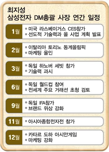 최지성 삼성전자 디지털미디어총괄(DM) 사장이 올해 영업 최전선에서 뛰어야 할 월별 주요 행사들이다. 최 사장은 이 일정들을 소화하기 위해 최소한 100일 이상을 해외에서 머물 예정이다. 최 사장은 “1996년 디자인 혁명 선언 이후 휴대전화와 TV 등에서 혁신적 디자인을 선보이는 등 나름대로 성과가 있었지만 아직 부족함이 있다.”면서 “올해는 지상파DMB 등 신개념의 제품을 지속적으로 출시해 디지털 르네상스의 선봉이 될 것”이라고 말했다.