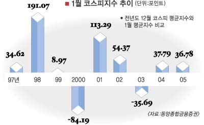 3일 동양종합금융증권에 따르면 1990∼2005년의 유가증권시장에서 1월 첫째주의 코스피지수와 연간 지수의 방향성을 비교한 결과,16년 중에서 12년이 일치했다. 즉 개장 첫 주일의 지수가 상승(하락)하면 연간 지수도 상승(하락)하는 비율이 75%에 달했다.1월 지수와 연간 지수가 일치하는 비율도 75%로 나타났다.1월, 개장 첫주의 지수가 지니는 의미는 그만큼 남다르다고 할 수 있다.