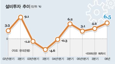 정부는 올해 설비투자 증가율을 6.5%로 전망했다. 국제유가를 배럴당 54달러, 원·달러 환율을 1010원으로 전제해서다. 한국개발연구원(KDI)은 6.9%,LG경제연구원은 6.8%로 각각 내다봤다. 삼성경제연구소는 정부와 같은 6.5%로 예측했다. 삼성경제연구소의 정형민 수석연구원은 “수출이 두자릿 수 증가를 유지하고 소비도 2004년 4·4분기부터 플러스 성장을 지속, 올해 설비투자를 다소 낙관하고 있다.”고 말했다. 하지만 변수로 원·달러 환율이 떨어질 경우 ‘수출 채산성 악화’와 유가인상에 따른 ‘내수 위축’을 꼽았다.