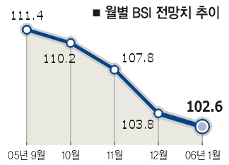 전국경제인연합회는 최근 매출액 상위 600대 기업의 경기실사지수(BSI)를 조사한 결과,1월 BSI 전망치는 102.6으로 기준치(100)를 웃돌았다고 3일 밝혔다. 그러나 지난해 9월 BSI가 111.4로 정점을 찍은 이후 10월 110.2,11월 107.8,12월 103.8 등으로 4개월 연속 하락세를 보여 경기 회복에 대한 기업들의 기대감이 둔화되고 있음을 보여줬다.