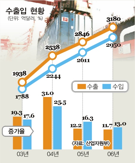 산업자원부는 3일 ‘2006년 수출입전망’을 통해 올해 수출은 지난해보다 11.7%가 증가한 3180억달러, 수입은 13%가 증가한 2950억달러에 달해 무역규모가 6130억달러에 이르고 무역수지는 230억달러의 흑자를 기록할 것으로 전망했다.