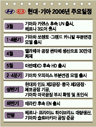 현대차는 앨라배마공장이 4월부터 신형 싼타페 생산에 돌입하면서 연 30만대체제로 가동된다. 체코공장(30만대)도 올해 중 기공식을 갖고 건설에 들어가 2008년이면 본격 가동된다. 이밖에 중국 제2공장(30만대), 인도 제2공장(15만대)도 올 상반기 중 착공에 들어가 이르면 내년 중 양산체제에 돌입한다.