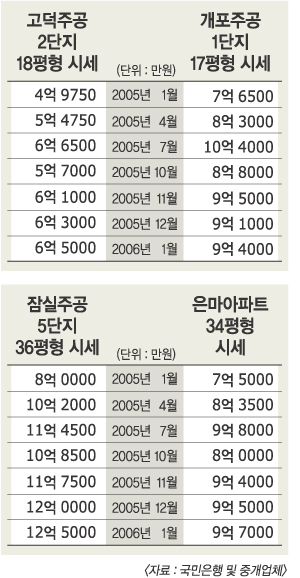 인근 Y공인 관계자는 “이런 추세라면 10억원 돌파는 시간 문제다.”고 기대감을 전했다. 은마 이외에 청실 등 완화된 용적률이 적용될 주변 재건축 단지도 동반 상승세다. 청실 35평형의 경우 4일 현재 9억원 초반대로 은마아파트와 보조를 맞추고 있다.