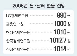 일부 외국계 투자기관에서는 원·달러 환율이 올 4·4분기에 950원선까지 떨어질 것으로 내다보고 있다. 상당수 국내 민간경제연구소들도 최근 환율하락을 추세적인 것으로 진단하고 있다. 올 평균환율을 1000원대 초반에서 900원대 후반으로 앞다퉈 수정 전망하고 있는 것도 이같은 분위기를 반영한다. 삼성경제연구소 정영식 연구원은 “최근 환율하락은 일시적이라기보다는 추세적인 것으로 볼 수 있으며, 올해 평균 환율도 세자릿수에 안착할 것으로 예상된다.”고 말했다. 하지만 환율 하락세가 연초부터 지나치게 나타나고 있을 뿐이며 일시적인 현상이라는 반론도 나오고 있다.