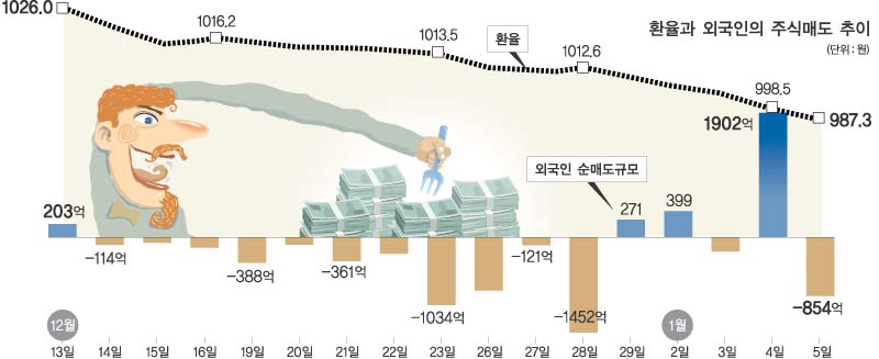 새해 벽두부터 큰 폭으로 떨어지는 원·달러 환율이 꼭 수출입 업체들에만 영향을 미치는 것은 아니다. 환율이 오르내릴 때마다 일상 생활에서도 ‘희비’가 교차한다.