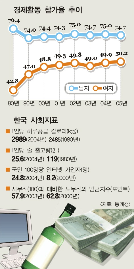 6일 통계청이 발표한 ‘2005년 한국의 사회지표’에 따르면 15세 이상 인구 가운데 경제활동에 참가한 비율은 지난해 62.1%로 2004년과 같다. 하지만 남성은 74.7%로 1년전보다 0.3%포인트 감소한 반면 여성은 50.2%로 0.2%포인트 증가했다. 특히 1980년 42.8%이던 여성의 경제활동참가율은 7.4%포인트 높아졌으나 남성은 같은기간 76.4%에서 1.7%포인트 떨어졌다. 이에 따라 전체 취업자에서 여성이 차지하는 비율은 41.7%로 80년 38.2% 이후 증가하는 추세다.