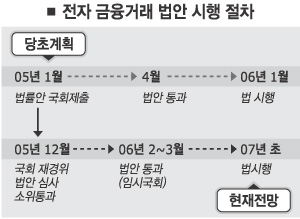8일 재정경제부와 금융권, 국회 등에 따르면 전자금융거래법안은 지난해 12월 초 국회 재경위 금융법안심사소위에서 통과됐다. 그러나 사학법 논란으로 국회가 파행으로 치달으면서 재경위 전체회의에서는 논의조차 안 됐다.