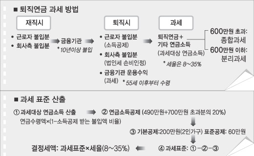 연금을 받을 때 매월 5%씩 원천징수한다. 연말에는 다른 연금소득과 합산해 과세대상 소득이 600만원이 넘으면 8∼35%의 세율로 종합과세한다. 합산액이 600만원 이하이면 연금소득을 합하지 않고 따로 분리과세한다. 연금 가입자가 퇴직금을 일시금으로 받거나 중도에 인출하면 일반 퇴직소득으로 간주, 정률공제(45%)와 근속 연수 등의 퇴직소득 공제를 받는다. 중도인출은 주택구입 및 본인과 가족의 6개월 이상 요양 등에만 허용된다.