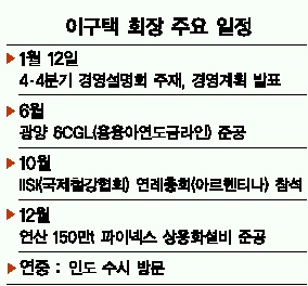 지난해 말 이 회장이 2주간 현지에 머물며 진두지휘한 인도 프로젝트가 올해 경영의 핵심으로 떠오를 전망이다. 이 회장은 “다른 경쟁사에 비해 인도측 분위기가 우호적이어서 3월이면 광권 탐사권을 획득하고 9월까지 부지매입을 완료할 수 있을 것”이라고 자신했다.