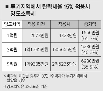 정부는 올해 주택·토지 투기지역에서 탄력세율 15%를 적용하는 방안을 검토하고 있다. 이 경우 비과세 요건을 갖추지 못한 1주택자가 올해 투기지역에서 집을 팔아 1억원의 양도차익(과세표준 기준)을 남겼을 때 4323만원을 세금으로 내야 한다. 탄력세율을 적용하지 않을 때 내야 할 세금 2673만원보다 1650만원(62%)이나 많다. 평균 양도세율이 24%에서 39%로 높아진 결과다.