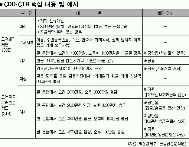 앞으로 금융기관에 새로 계좌를 개설하거나 한번에 2000만원 이상의 현금을 거래하려는 사람은 지금보다 복잡한 신원확인 과정을 거쳐야 된다.5000만원 이상의 현금거래는 금융정보분석원(FIU)에 무조건 보고된다.FIU는 이같은 내용을 담은 고객알기제도(CDD)와 고액현금거래보고제도(CTR)를 18일부터 본격 시행한다고 17일 밝혔다. 일부에서는 ‘제2의 금융실명제’라고 부를 만큼, 현금거래 관행에 큰 변화를 가져올 것으로 전망된다.