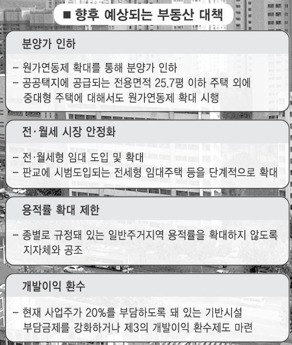 주무부처인 건설교통부 관계자는 “이제 논의가 시작되는 단계이기 때문에 어떠한 방향도 서지 않았다.”고 밝히고 있지만 ▲분양가 인하 ▲전·월세시장 안정화 ▲용적률 확대 제한 ▲개발이익 환수 강화 등 다각도로 진행될 것이란 전망이 유력하다.