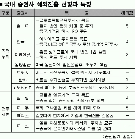 특히 중·소형 증권사들은 승부수를 해외시장 선점에서 찾고 있다. 브릿지증권은 지난해말 업무제휴를 한 베트남 탕롱증권과 함께 베트남 자산관리공사(DATC)와의 독점제휴를 추진중이다. 올 상반기에는 아예 베트남 현지에 자산운용사를 설립하고 증권사에 지분출자를 할 예정이다. 그런가 하면 메리츠증권은 국내 증권사들이 베트남으로 몰려가자 한발 더 나아가 캄보디아에 먼저 진출할 계획이다. 국내 기업이 캄보디아에 투자할 때 모든 컨설팅을 독차지한다는 야심찬 구상을 하고 있다.