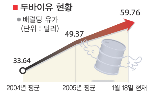 19일 한국석유공사에 따르면 18일 거래된 두바이유 현물가는 배럴당 59.76달러로 전날보다 1.06달러 올랐다. 이는 사상 최고가를 기록했던 지난해 9월1일의 59.45달러를 넘어선 것이다.