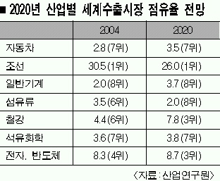 제조업의 세계수출시장 점유율은 2004년 3.5%(8위)에서 2020년에 4%로 높아져 7위로 올라서고 고성장시에는 영국, 이탈리아를 제치고 6위로 부상할 것으로 봤다.