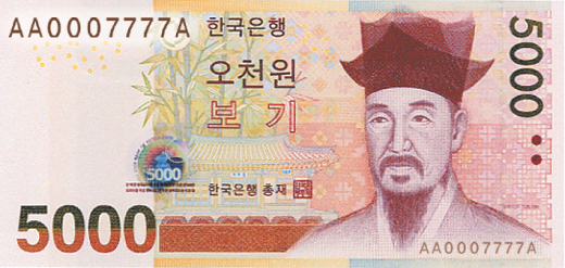 지난 2일부터 발행된 새 5000원짜리 중 일부의 값이 천정부지로 치솟고 있다.20일 한국은행과 인터넷 경매사이트 옥션(www.auction.co.kr)에 따르면 지난 19일 오후 5시부터 새 5000원권 일련번호 6710∼1만번에 대한 경매를 시작한 결과 이날 오전까지 수백명이 입찰에 참여했다. 특히 7777번째로 인쇄된 화폐 일련번호 ‘AA0007777A’의 지폐가 포함된 7771∼7780번 사이의 10장 묶음은 32명이 입찰에 참여해 현재 가격이 액면가의 50배인 250만원에 달하고 있다.5000원 지폐 한장이 25만원에 거래되는 셈이다.
