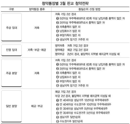 서울 300만원, 수도권 200만원, 기타 광역시 250만원의 예치금을 가진 예금·부금 가입자들은 3월에 나오는 민간분양 물량에만 청약할 수 있다. 전체 민간분양 물량중 30%는 성남거주자에게 우선 배정한다. 만 40세 이상으로 성남지역에 거주했고 10년이상 무주택가구주인 사람들이 최우선순위로 분류돼 총 여섯번의 청약 기회를 노릴 수 있어 당첨 확률이 가장 높다. 그러나 이들이 3월에 떨어졌을 경우 8월에 도전할 기회는 없다. 중대형 평형에 청약할 수 있는 청약 예금으로 증액할 경우 1년 이후에나 사용할 수 있기 때문이다.