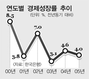 25일 한국은행이 발표한 ‘2005년 4·4분기 및 연간 실질 국내총생산(GDP)’에 따르면 지난해 4·4분기 실질 GDP는 전년 동기에 비해 5.2% 증가했다.2004년 2·4분기(5.5%) 이후 가장 높은 수치다. 건설투자가 부진했지만 수출, 설비투자 등에서 고른 증가세를 보인 영향이 컸다.