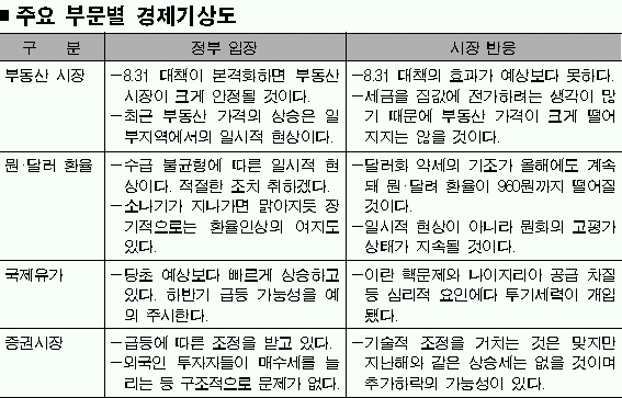 새해들어 경제가 요동치고 있다. 주식시장이 불안하고, 환율은 수급 불균형으로 외환위기 이전 수준으로 떨어지는 등 안정을 찾지 못한다. 우리 경제의 최대 ‘복병’으로 지목받던 국제유가는 다시 들썩이고, 참여정부가 ‘배수의 진’을 쳤던 ‘8·31 부동산 대책’의 효과도 불투명하다. 정부는 구조적으로 큰 문제가 없다고 자신한다. 부동산 대책이 본격 가동되면 집 값은 안정될 것으로 내다본다. 증시나 외환시장 역시 일시적인 ‘난기류’에 빠진 것으로 진단한다. 다만 유가의 상승 속도가 빨라진 점에 유의하는 정도다. 반면 시장의 ‘체감온도’는 다소 낮다. 증시나 유가에 대한 인식은 정부와 비슷하지만 부동산이나 원·달러 환율의 전망에는 다소 차이가 있다.