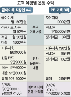 매월 150만원씩 급여이체를 한 직장인 A씨가 은행에 안겨 준 연간 수익은 90만 2000원이다. 한편 정기예금 3억원, 수시입출금식예금(MMDA) 1억 5000만원, 자유저축 1000만원 등 4억 6000만원을 은행에 맡긴 PB고객 B씨에게서 나온 은행의 연간 수익은 219만원이다.