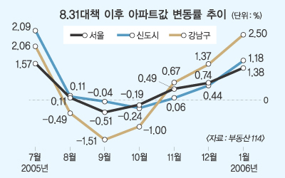 8·31대책이 나온 지 5개월이 지났지만 아직 시장에서는 약발이 먹히지 않고 있다. 서울 강남 집값은 재건축 대상 아파트를 중심으로 8·31대책 이전보다 오히려 올랐다. 반면 서울 변두리 지역은 값이 떨어지는 양극화 현상이 깊어졌다. 다음달 판교 분양을 앞두고 강남 아파트값 상승세는 용인·분당 등으로 확산되는 추세다.