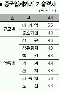 대한상공회의소가 최근 전국 300개 제조업체를 대상으로 ‘중국의 기술 추격과 업계의 대응 실태’를 조사해 31일 내놓은 결과에 따르면 응답기업의 86%가 “한·중 기술격차가 갈수록 좁혀지고 있다.”면서 이같이 밝혔다. 기업 규모별로는 대기업이 평균 5.5년, 중소기업은 4.3년 정도 중국보다 기술이 앞선다고 했다. 업종별로는 조선에 이어 자동차가 5.3년, 철강 4.8년, 섬유 4.6년, 기계 4.4년, 석유화학 4.0년, 전자 3.3년 순으로 조사됐다. 조선·철강의 ‘굴뚝업종’기술 격차가 전자로 대표되는 정보기술(IT)보다 평균 2년 이상 길었다.