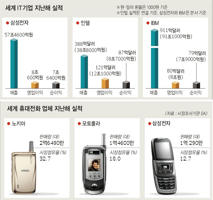 단순히 연간 영업이익으로 따지면 세계 최대 컴퓨터업체인 IBM(80억달러)을 간발의 차로 제쳤으며, 반도체 부문 영업이익률에선 세계 최대 반도체업체인 인텔(영업이익률 31%)에 버금갔다. 휴대전화 부문은 ‘가장 비싼 휴대전화(휴대전화 평균 판매단가 179달러)’의 명성을 유지하며 노키아, 모토롤라와 함께 시장점유율 두자릿수를 유지했다. 다만 지난해 하반기의 ‘선전’에도 불구하고 상반기의 부진이 워낙 커서 순이익 ‘100억달러 클럽’을 1년 만에 물러난 것이 아쉬운 정도다.