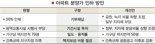 용적률을 올리고 고층 아파트를 적극 허용하는 것이 택지 비용 원가를 줄이는 길이다. 재건축·재개발지구도 만찬가지다. 택지로 개발하는 땅은 이미 자연의 상태가 아니다. 저층 아파트를 지어 아파트가 들어서는 바닥 면적만 늘릴 것이 아니라 고층 아파트를 짓는 대신 동간(棟間) 거리를 충분히 확보하는 것이 훨씬 쾌적한 단지가 된다. 환경 피해를 최소한으로 줄이기 위해서라도 개발 밀도를 상향 조정하는 방안이 나와야 한다.