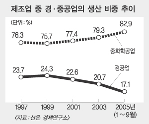 3일 산업은행에 따르면 제조업중에서 경공업이 차지하는 생산비중은 외환위기가 발생한 1997년 23.7%에서 지난해(1∼9월)는 17.1%로 크게 낮아졌다. 반면 같은 기간 중화학공업의 비중은 76.3%에서 82.9%로 높아졌다.