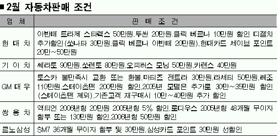 기대를 모았던 자동차 내수가 특별소비세 환원 조치 등으로 ‘제동’이 걸린 가운데 자동차업체들이 ‘2월 상차림’을 내놓았다.1월에 비해 할인 혜택이 다양해졌고 일부 수입차업체는 2월에도 특소세 환원 전 가격으로 판매하는 등 파격적인 할인도 적지않다.