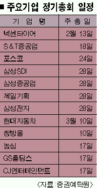한편 넥센타이어는 정기주총 시간을 앞당기며 7년 연속 주총 1위를 사수했다. 넥센타이어는 오는 13일 오전 9시30분에 개최 예정이던 주총을 30분 앞당겨 9시에 연다고 이날 정정 공시했다. 이유는 넥센타이어보다 30분 앞서 주총을 열겠다는 기업이 나타났기 때문이다. 넥센타이어는 지난해까지 6년 연속으로 상장·등록된 1000여개 12월 결산법인들 가운데 가장 먼저 주총을 개최했다.