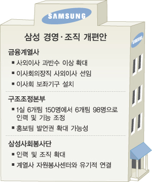삼성이 지난 7일 ‘국민여론 부응 5개 조치’를 발표한 이후 계열사별 새틀짜기가 관심사로 떠오르고 있다. 특히 삼성생명과 삼성화재 등 금융계열사는 이사회 의장 교체가 예고된 만큼 어떤 식으로든 경영과 조직에 메스가 가해질 것으로 보인다. 또 구조조정본부의 기능을 조정하면서 그동안 일사불란했던 삼성의 관리시스템도 어느 정도의 변화가 불가피해 보인다.