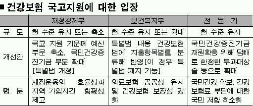 하지만 재경부는 국고지원 비율 50%를 완전히 없애거나 대폭 축소하는 ‘급격한 변화’는 고려하지 않고 있다. 대신 이 비율을 유지하되, 국가예산 지원을 줄이고 건강증진기금 출연 규모는 늘리는 재정운용의 효율성 측면을 강조하고 있다. 국고지원 자체를 줄이면 국민의 보험료 부담이 커져 반발이 거세질 것이라는 우려 때문이다.