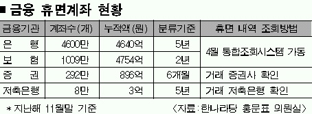 한나라당 홍문표 의원이 조사한 자료에 따르면 지난해 11월말 기준 은행의 휴면계좌 수는 4600만 8875개, 누적액은 4640억여원에 이른다. 국민 한 사람이 1만원씩 입금된 은행계좌 1개씩을 갖고 있는 셈이다. 보험 계좌는 1009만여개에 4754억원, 증권 계좌는 292만여개에 896억원으로 집계됐다. 저축은행도 8만여개,3억여원에 이른다.